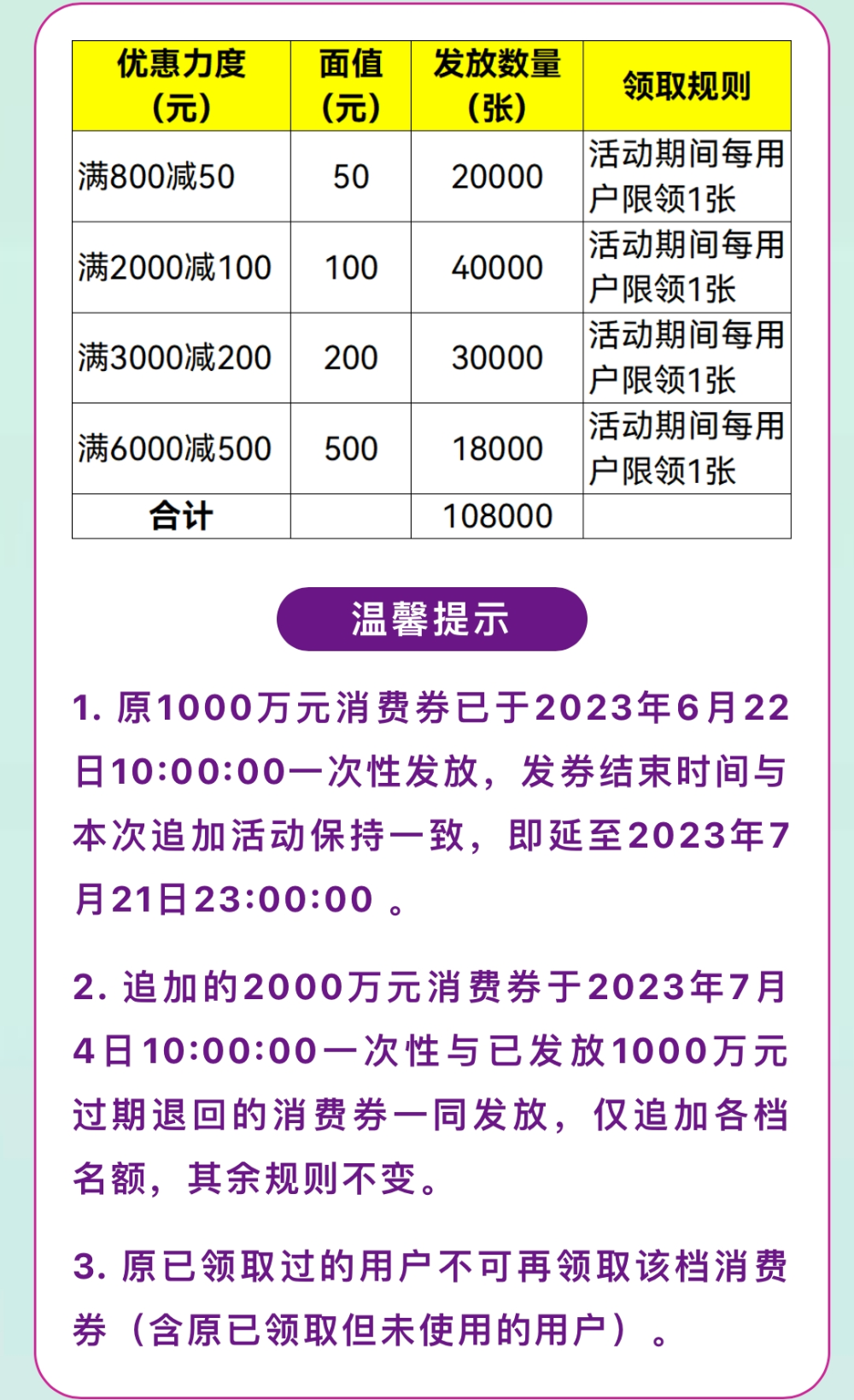 據介紹,本次離島免稅消費券的發券時間為7月4日-7月21日的每日10點-23點。消費券共計分為4檔,分別為滿800元減50元、滿2000元減100元、滿3000元減200元以及滿6000元減500元,發放數量分別為20000張、40000張、30000張與18000張,活動期間每名用戶限領一張,先到先得,領完即止。